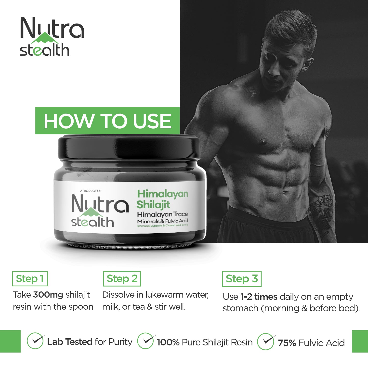 Revitalize your body and mind with Nutra-Stealth Shilajit — sourced from the high-altitude mountains of Pakistan, rich in fulvic acid and 85+ trace minerals. Pure, potent, and lab-tested for your daily wellness.
